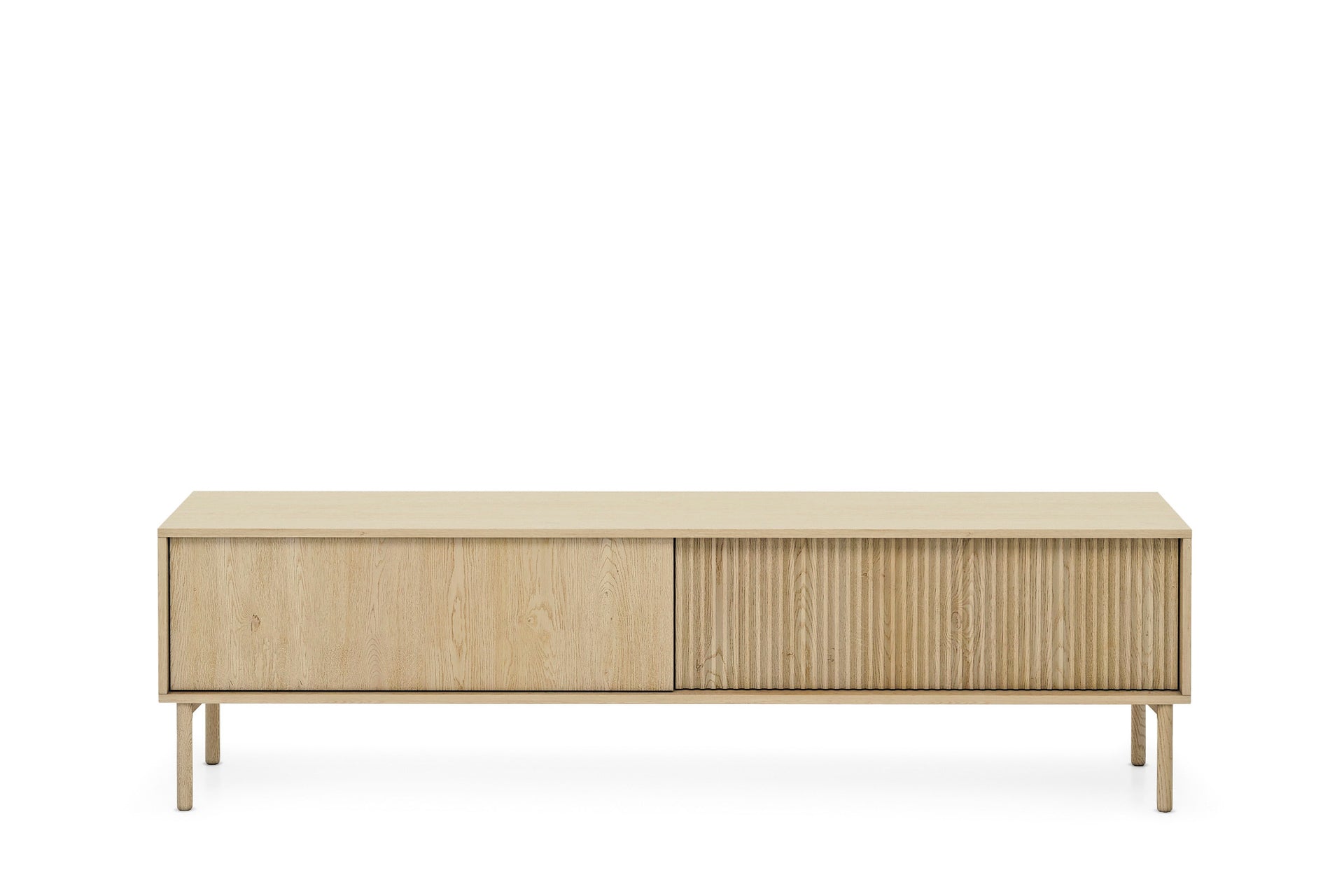 This TV stand includes a combination of open and closed storage space with a unique ribbed door design, offering an organized and tidy space for your electronics, media, and decorative items. The elegant, light oak effect adds warmth to any room, while the clean lines and sturdy legs provide a contemporary and timeless design.